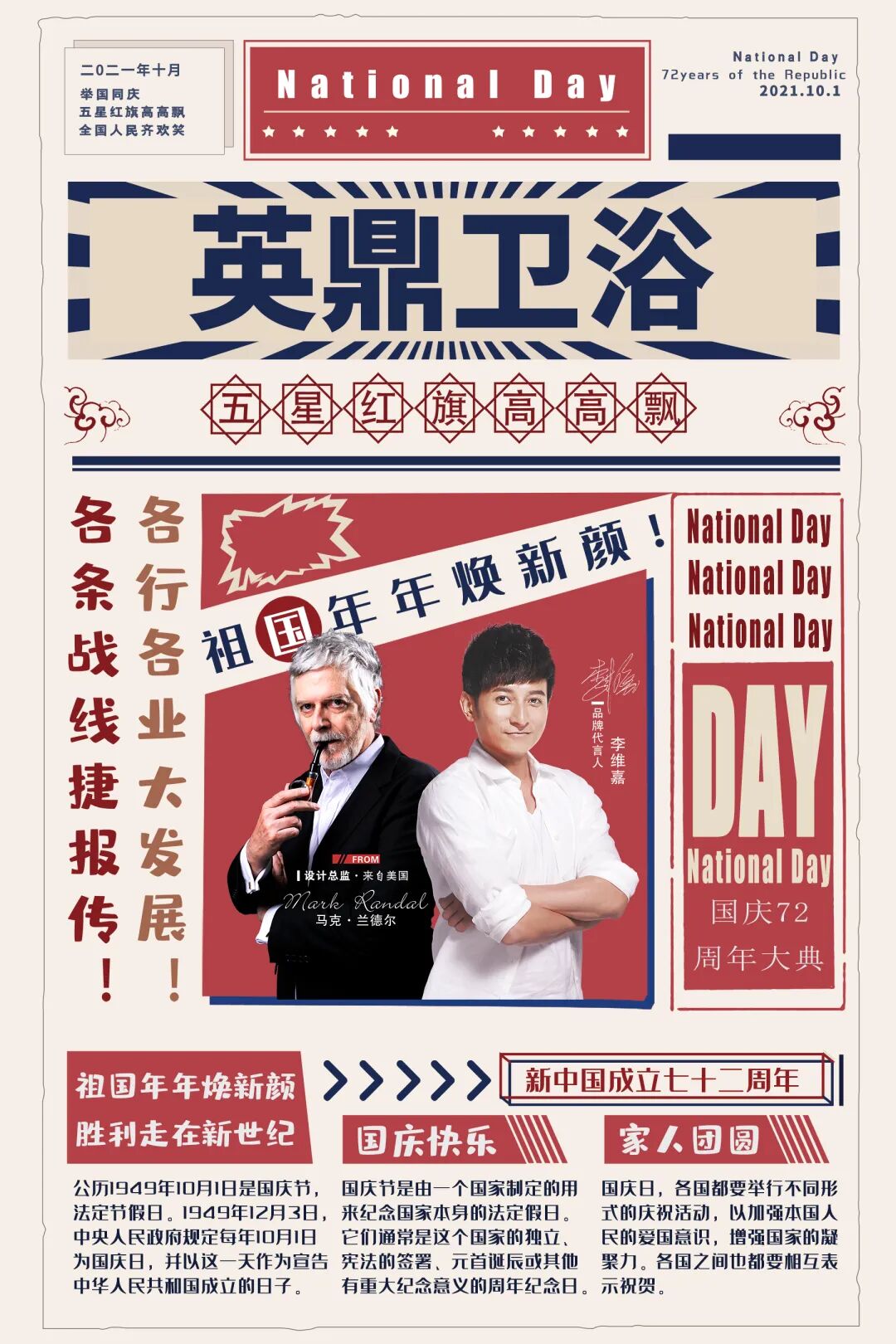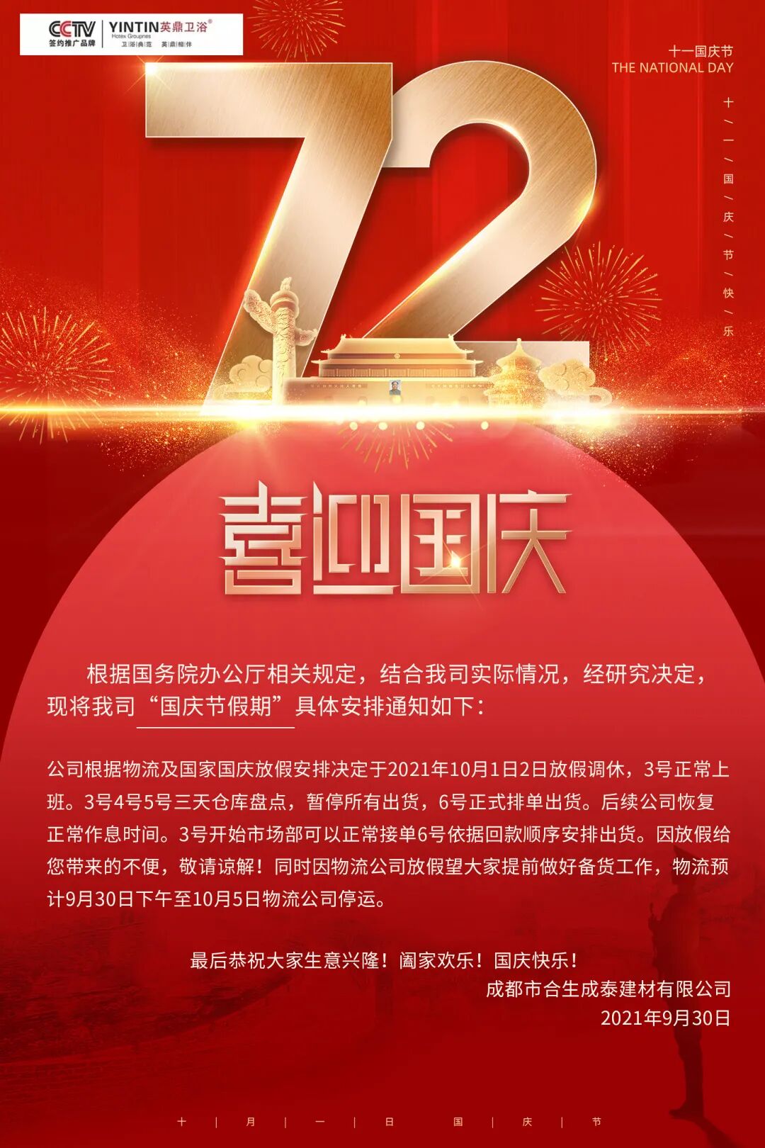 锦绣中华 盛世华诞 今年是新中国成立72周年。 国家之繁荣发展,闪烁着千千万万个家庭幸福美满之光。怀念建立不朽功勋的革命先烈们,致敬为共和国的今天做出不懈努力和奋斗的英雄们,感谢每一位普通而认真活着的不平凡人,建设、见证和分享家国喜乐。第一个百年奋斗目标实现收尾,中国将要开启新发展阶段征程。 01 董事长致辞 各位亲爱的伙伴们,大家好! 金秋十月,丹桂飘香,在这个喜迎丰收的季节里,我们的祖国即将迎来72岁的华诞,在此我谨代表佛山市英鼎卫浴有限公司董事会及全体员工,祝伟大的祖国生日快乐,繁荣昌盛,祝大家国庆快乐! 72年,弹指一挥间,旧中国的千疮百孔已经消散在历史长河中。如今我们的祖国经济高速发展,科技硕果累累,综合国力日益强盛,在这样的时代背景下,各行各业迎来了蓬勃向上的发展机遇。英鼎卫浴积极承担企业责任,坚持用心服务,让拥护政策、合理合规成为英鼎卫浴发展的主旋律,为行业赋能,为我国卫浴行业的发展贡献一份力。 民之所望,政之所为。 双碳目标的提出是中国主动承担应对全球气候变化责任的大国担当,在2020年英鼎卫浴就开始加快调整产业结构,以节能减碳为导向,加快推进淘汰落后产能、过剩产能,推动传统高耗能行业绿色化、低碳化改造,开展清洁生产,发展绿色工厂。力争成为新时代具备竞争力和受人尊敬的国产卫浴品牌。 圆梦之行,基于跬步。 乘风好去,长空万里,直下看山河! 时代赋予了英鼎卫浴机会与责任,我们也将不断探索,以谦卑的心态和只争朝夕的精神,继续推动中国卫浴行业的健康发展。 祖国通过自身的不断改革保持持续发展活力,才是我们中国企业得以不断向前、屹立于世界市场的动力源泉,才是社会、家庭更加和谐、稳定、安宁的重要力量。 在伟大的中华人民共和国成立72周年到来之际,我谨代表英鼎卫浴全体员工恭祝大家节日快乐,祝愿我们的祖国更加繁荣昌盛! 02 感恩祖国,感恩有你 乘风好去,长空万里,直下看山河! 时代赋予了新中国实现中华民族伟大复兴的责任,也赋予了英鼎卫浴推动中国造的机会,我们也将不断探索,以谦卑的心态和只争朝夕的精神,继续推动国产卫浴的新发展。 我们深知,英鼎卫浴的事业能够在短短数年的时间里,便取得如此长足的发展。离不开许多人的支持与信赖: 一路走来,社会各级政府部门、各级领导给予了英鼎卫浴无微不至的关怀和鼓励,感谢你们,让英鼎卫浴得到了温暖、看到了期望; 一路走来,最可爱的合作伙伴、优秀的家人们,用顽强的毅力、持之以恒的精神不断奋勇向前,成为了英鼎卫浴前进的动力,感谢你们,让英鼎卫浴更加有力量,更加精彩; 03 英鼎卫浴放假通知 根据国务院办公厅相关规定,结合我司实际情况,经研究决定,现将我司“国庆节假期”具体安排通知如下: 公司根据物流及国家国庆放假安排决定于2021年10月1日2日放假调休,3号正常上班。3号4号5号三天仓库盘点,暂停所有出货,6号正式排单出货。后续公司恢复正常作息时间。3号开始市场部可以正常接单6号依据回款顺序安排出货。因放假给您带来的不便,敬请谅解!同时因物流公司放假望大家提前做好备货工作,物流预计9月30日下午至10月5日物流公司停运。 最后恭祝大家生意兴隆!阖家欢乐!国庆快乐! 成都市合生成泰建材有限公司 2021年9月30日 —END— 长按识别二维码关注我们