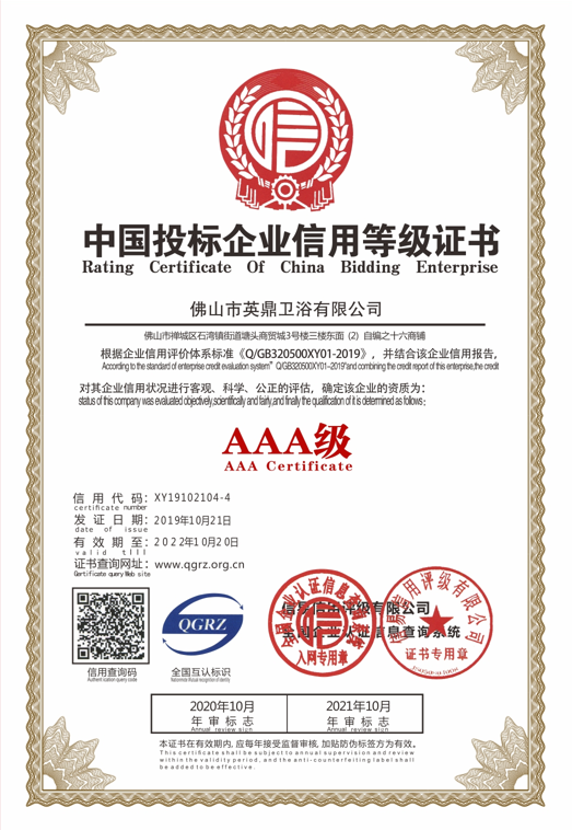 中国投标企业信用等级证书