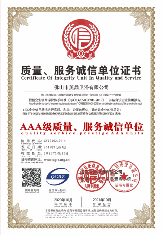 质量、服务诚信单位证书
