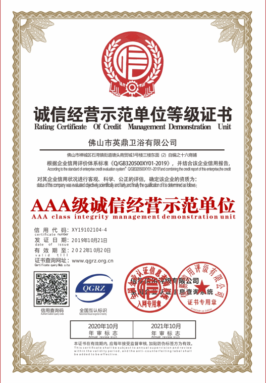 诚信经营示范单位等级证书