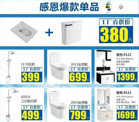 活动期间英鼎卫浴超值单品任你抢,工厂直销,百万让利。原价1280元的高温陶瓷马桶限时抢购价699元,原价980元的全铜高杆大花洒限时抢购价399元,极限特供,售完为止。还有高档浴室柜低至1399元,极限特供,抢完为止!