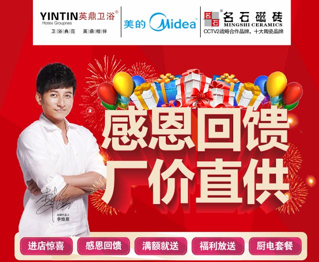 豪门盛宴,限时大促。英鼎卫浴携手美的电器、名石磁砖限时促销活动震撼来袭,优惠大酬宾,幸运多多,惊喜大礼等着你。